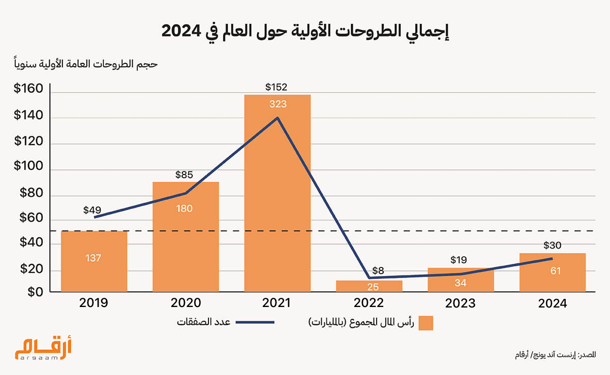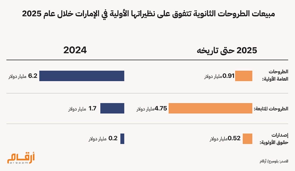 أما في الإمارات، فقد طغت العروض المتابعة أو الثانوية (Follow-on Offering)، وهي إصدارات الأسهم الإضافية المعروضة للبيع من قبل الشركات المدرجة بالفعل، على الطروحات العامة الأولية. وقد قاربت حصيلة هذه الإصدارات الثانوية 5 مليار دولار هذا العام، متجاوزة بذلك حصيلة نظيراتها الأولية.