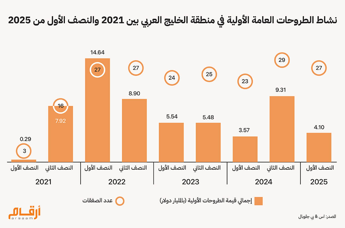 عموما، أظهرت أسواق المنطقة نشاطاً قوياً مع تزايد اهتمام المستثمرين المتواصل، حيث شهدت 11 اكتتاباً عاماً جمعت إجمالي عوائد بقيمة 0.7 مليار دولار بنهاية الربع الثالث من 2025، مسجلةً زيادة قدرها 120% في عدد الإدراجات مقارنة بالربع نفسه من العام الماضي.
