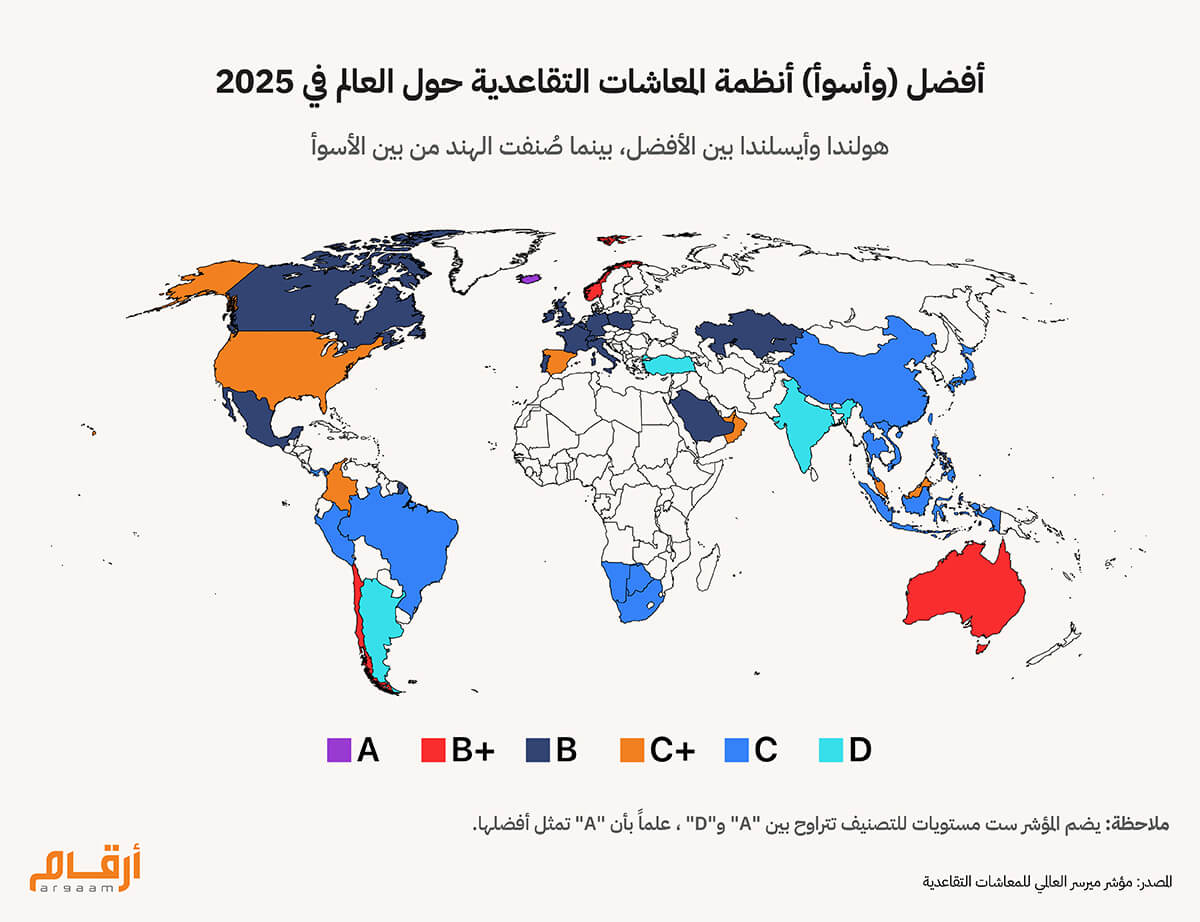 ملاحظة: يشير مبدأ الدفع حسب الاستحقاق إلى أن الاشتراكات الحالية من السكان العاملين تُستخدم لسداد معاشات المتقاعدين الحاليين. وقد انضمت سنغافورة في اكتوبر 2025 للمرة الأولى إلى الفئة العليا في المؤشر العالمي السنوي للمعاشات التقاعدية، فيما احتفظت هولندا بصدارة التصنيف. ![]() وتأتي أيسلندا والدنمارك بعدهما لتُشكّلا بقية الدول الأربع الأولى التي حصلت على تصنيف A في مؤشر ميرسر العالمي للمعاشات التقاعدية بالتعاون مع معهد المحللين الماليين المعتمدين (Mercer CFA Institute Global Pension Index) لهذا العام. يُقيّم التقرير 52 نظاماً تقاعدياً بناءً على نقاط تُمنح لكفايتها واستدامتها ونزاهتها. وقد حصدت المملكة العربية السعودية 67.6 نقطة في 2025، لتصنف في المستوى الثاني B حسب معايير المؤشر. ويُوصَف النظام من فئة B بأنه يتمتع ببنية سليمة وبالعديد من المزايا الجيدة، ولكن بعض الجوانب لديه بحاجة إلى تحسينات. تجاوز تصنيف المملكة نظيره الممنوح الإمارات العربية المتحدة، التي سجلت 64.9 نقطة، فيما توسطت السعودية الإمارات والكويت، بعدما تصدرت الأخيرة التصنيف في العالم العربي بمجموع 71.9 نقطة من أصل 100. يذكر أن تقييم المملكة ارتفع هذا العام إلى 67.6 من 60.5 نقطة في 2024، ويعود ذلك في المقام الأول إلى تقديم بيانات أوضح وأكثر شمولاً حول النظام السعودي للمعاشات التقاعدية. |