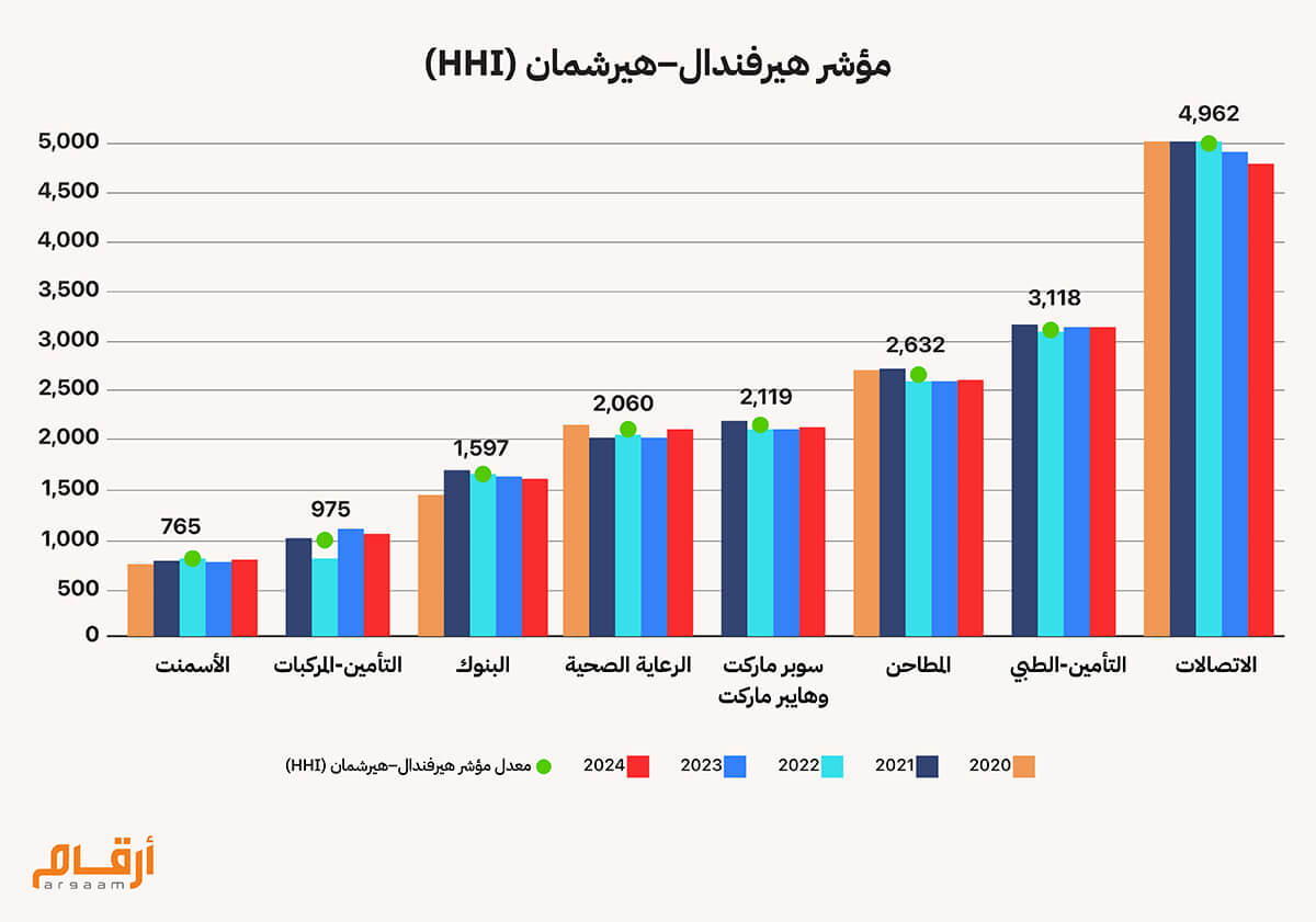 📉 ثالثاً: منافسة ضعيفة HHI مرتفع