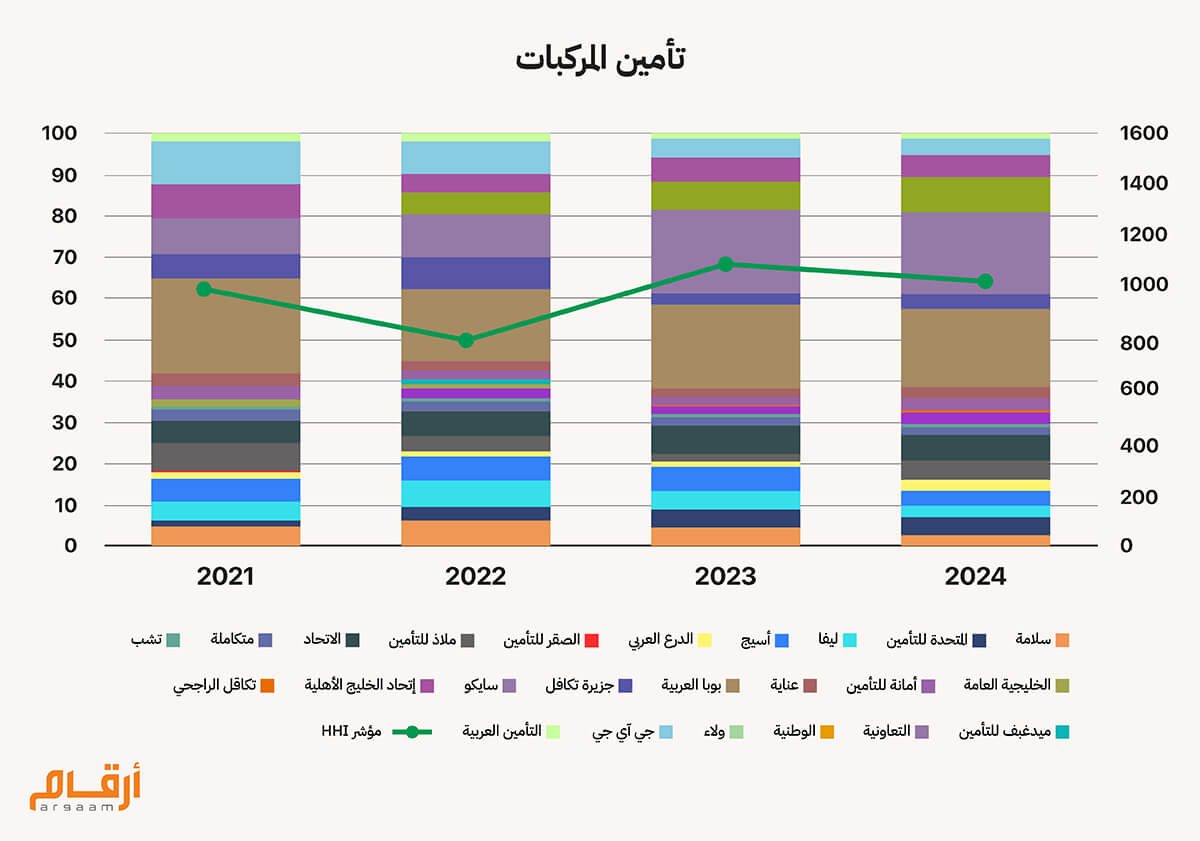 يتنافس في قطاع تأمين المركبات 24 شركة مدرجة في السوق المالية، وتأتي شركة التعاونية في المقدمة بحصة سوقية 20% من إجمالي أقسط التأمين المكتتبة خلال عام 2024، يليها شركة تكافل الراجحي في بحصة سوقية 19% ثم شركة الوطنية بـ 8.5% والأتحاد بـ 6% ، ثم باقي الشركات بحصص لا تتخطي الـ 5% لكل شركة على حدى. مؤشر HHI للقطاع بلغ 1026 نقطة خلال عام 2024 ومتوسط فترة الدراسة هو 975 نقطة، مما يعني أن تركز القطاع منخفض ما يعكس منافسة عالية. ![]()