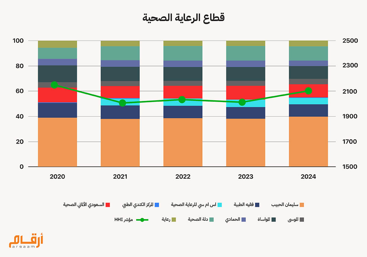 تشابه قطاع الرعاية الصحية في المملكة مع قطاعي التأمين والبنوك من حيث التركز حيث أن قطاع الرعاية الصحية تركزه متوسط إى منافسة معتدلة. يتكون القطاع من 10 شركات مدرجة في السوق وفي المقدمة تأتي شركة سليمان الحبيب بحصة سوقية حوالي 40% من ايرادات القطاع في عام 2024، ثم دلة الصحية بحصة سوقية 11% ثم فقية الطبية والسعودي الألماني الصحية والمواساة بحصة تبلغ حوالي 10% لكل شركة مما يعكس تركز عالى في القطاع حيث أن شركة واحدة تسيطر علي 40% وأربع شركات أخرى تمثل نفس النسبة مجتماعين. باقي شركات القطاع الخمس لا تتجاوز حصتهم من أيرادات القطاع 5% لكل شركة على حدى. مؤشر HHI لقطاع الرعاية الصحية بلغ 2100 نقطة في 2024 ومتوسط فترة الدراسة هو 2060 نقطة حيث يميل القطاع إلى التركز المتوسط - منافسة معتدلة. ![]()