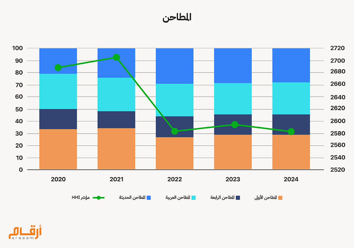 يتكون قطاع المطاحن من أربع شركات هما شركة المطاحن الأول والمطاحن الرابعة والمطاحن العربية والمطاحن الحديثة. تأتي المطاحن الأول بحصة 29% من ايرادات هذا القطاع خلال عام 2024، ثم المطاحن العربية والمطاحن الحديثة بحصة 27% لكلاً منهما. وفي المركز الرابع تأتي المطاحن الرابعة بحصة 18% من ارادات القطاع. يظهر مؤشر HHI درجة تركز مرتفع - منافسة ضعيفة في القطاع حيث بلغ المؤشر 2583 نقطة في 2024 بمتوسط 2632 نقطة خلال فترة الدراسة، يظهر المؤشر أيضاً تحول كبير في القيمة من عام 2020 حيث كان المؤشر 2690 نقطة تم أصبح 2583 في عام 2024 بعد أن فقدت المطاحن الأول والمطاحن العربية جزء في حصتها من الإيرادات لصالح الشركتين الأخرتين ، الأمر الذي قد يؤدي إلى نزول المؤشر دون 2500 نقطة والتي تجعل من تركز القطاع متوسط وتصبح المنافسة أكثر. ![]()