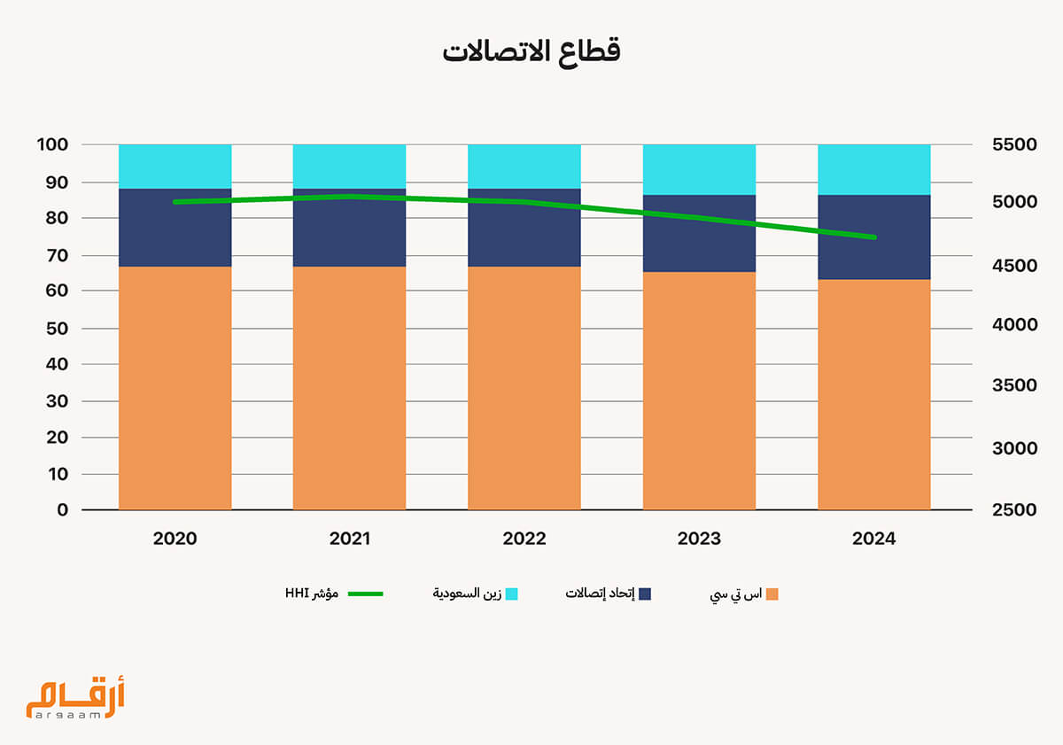 يتكون قطاع الاتصالات – الجوال من ثلاث مشغلين في السوق السعودي ، تتصدر اس تي سي الحصة السوقية والتي تمثل حوالى 63% من ايرادات القطاع خلال عام 2024، وجاء في المرتبة الثانية شركة إتحاد إتصالات – موبايلي والتي استحوذت علي 23% من ايرادات القطاع، وزين السعودية بحصة في ايرادات القطاع بلغت 13%. يظهر مؤشر HHI درجة تركيز مرتفع - منافسة ضعيفة في القطاع حيث بلغ المؤشر 4779 نقطة في 2024 بمتوسط 4962 نقطة خلال فترة الدراسة، نظراً أستحواذ شركة اس تي سي واتحاد الإتصالات على 86% من ايرادات القطاع من داخل المملكة. وتجدر الاشارة إلى أن أغلب قطاعات الاتصالات في معظم دول العالم تتسم بالتركز المرتفع نظرة لقلة عدد المشغلين داخل الدولة الواحدة والحاجة لاستثمارات كبيرة لدخول مشغلين جدد في القطاع. ![]()