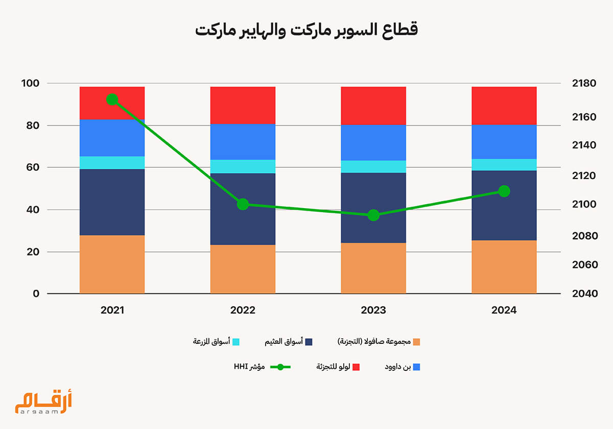 هناك ثلاث شركات في القطاع يعتبر نشاط التجزئة هو النشاط الرئيسي لها وهي شركة أسواق العثيم وشركة أسواق المزرعة وشركة بن داود، لكن حتى تكتمل الصورة ونتمكن من الحكم على هذا القطاع بشكل أفضل تم أضافة ايرادات كلاً من شركة صافولا الخاص بنشاط التجزئة وإيرادات شركة لولو للتجزئة المحققة داخل المملكة العربية السعودية. حيث بلغ حصة أسواق العثيم 34% من ايرادات القطاع خلال عام 2024 ومجموعة صافولا - التجزئة 26% من ايرادات القطاع. يليهم شركة لولو للتجزئة بحصة 18% وشركة بن داود بحصة 16%. أما أسواق المزرعة 6% من ايرادات القطاع مجتمعين. مؤشر HHI للقطاع بلغ 2109 نقطة في 2024 ومتوسط فترة الدراسة هو 2119 نقطة حيث يميل القطاع إلى التركز متوسط - منافسة معتدلة. ![]()