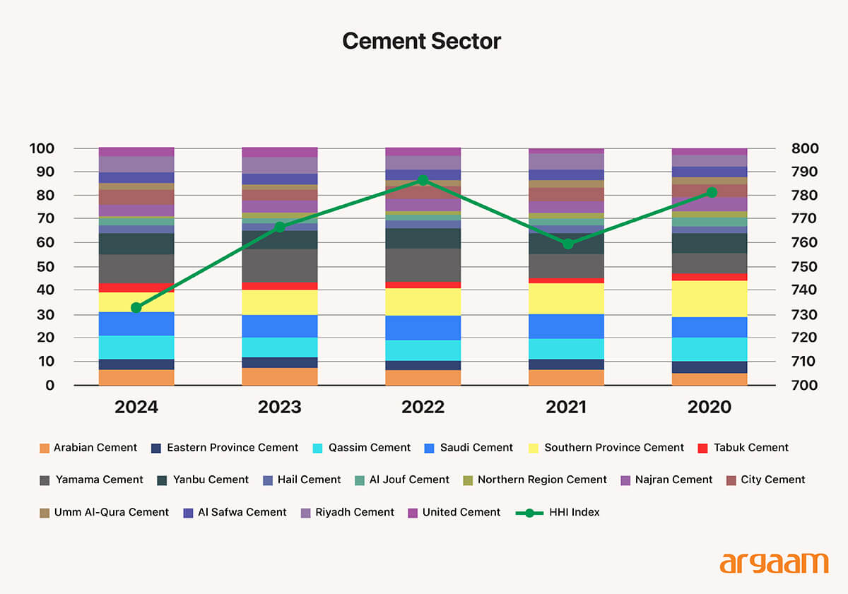Only two companies accounted for more than 10% of domestic cement sales in 2024; namely, Yamama Cement Co. and Saudi Cement Co., with market shares of 12% and 10%, respectively.