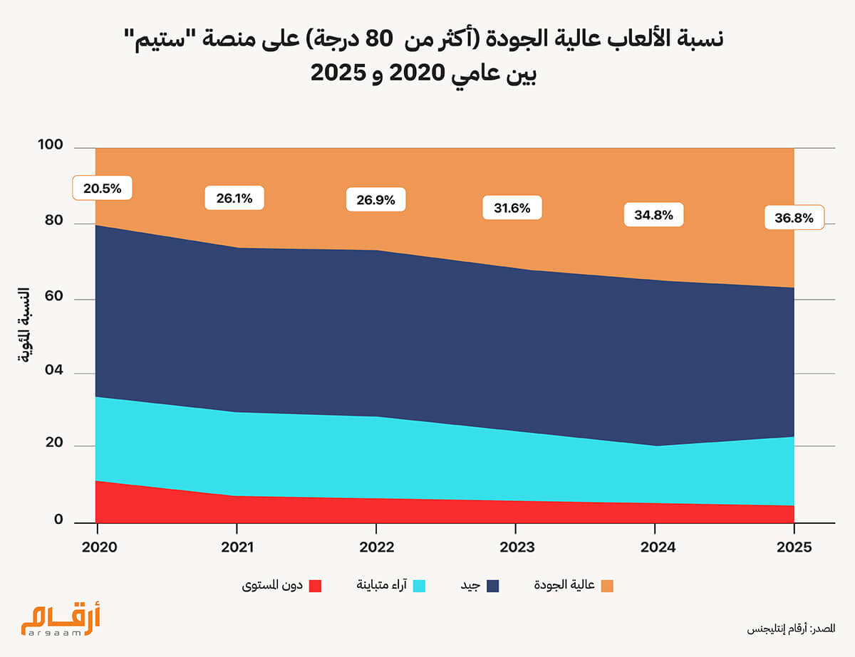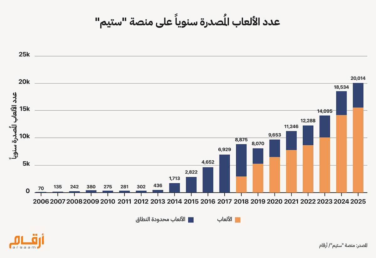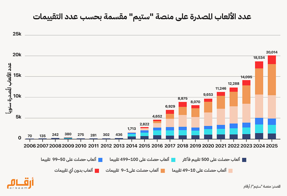 مفارقة التخمّة السوقية وتآكل الربحية باتت وفرة الإصدارات الكبرى سبباً رئيسياً في انحسار العوائد حتى بالنسبة لكبريات الشركات، حيث أدى هذا التنافس المحموم على جذب اهتمام المستهلك والاستحواذ على حصص الإنفاق الاستهلاكي إلى نتائج عكسية. فبحسب البيانات السوقية، تتراجع القدرة التنافسية لنحو 83% من ألعاب الجوال الجديدة خلال السنوات الثلاث الأولى من إطلاقها، بينما تتراجع الشركات المطورة عن الاستثمار في حوالي 43% من الألعاب خلال مراحل التطوير المختلفة قبل طرحها في الأسواق. ويشكل هذا التشبع خطراً نظامياً على المحفظة الاستثمارية، إذ يؤدي إلى انخفاض مبيعات كل إصدار على حدة، فضلاً عن تآكل هوامش الربح وتباطؤ معدلات النمو. يتصل جانب آخر من التشبع بسلوك اللاعبين أنفسهم؛ إذ تُظهر البيانات أن الغالبية الساحقة لا تخصص وقتاً يُذكر لتجربة أغلب الإصدارات الجديدة. وتشير أحدث الإحصاءات المتاحة إلى أن نحو 6.5% فقط من إجمالي وقت اللعب يُخصص للألعاب الجديدة، بينما يتمسك معظم المستخدمين بالألعاب الشهيرة التي اعتادوا عليها. قفز عدد الإصدارات السنوية على منصة ستيم (Steam) من 8,070 لعبة في عام 2019 إلى 20,014 لعبة في عام 2025، أي بزيادة بلغت 148%، بما يعادل 2.48 ضعف مستويات ما قبل جائحة كوفيد-19 تقريباً. وقد أدى هذا العدد الكبير من الألعاب إلى تفاقم أزمة العرض المفرط مقابل الطلب المحدود، حيث تشير البيانات إلى أن نحو 50% من إصدارات 2025 لم تحصد أكثر من عشر تقييمات من المستخدمين، وهو ما يعني أن نصف الإصدارات الجديدة لا يجد طريقه إلى السوق. ![]()