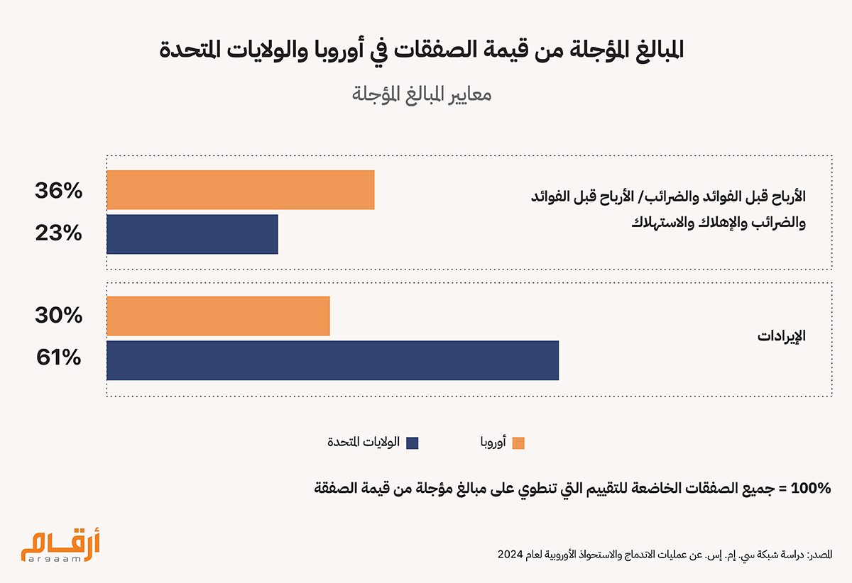 وفي الولايات المتحدة، عادة ما تكون الشركات المستحوذة الاستراتيجية شركات معتادة الاستحواذ، خاصة في قطاعات التكنولوجيا، والرعاية الصحية، والصناعات. وتحفزها خبرتها الواسعة في تنفيذ صفقات الدمج والاستحواذ على تفضيل هياكل موحدة لسداد قيمة الصفقة، ومنها: دفع المقابل نقدًا أو بأسهم أو بمزيج منهما، وسداد المبلغ كاملًا عند إتمام الصفقة أو تأجيل مبالغ من قيمة الصفقة وسدادها عند تحقيق الشركة أهدافاً معينة فيما يتصل بالأداء، ويتوقف الاختيار بين سداد قيمة الصفقة كاملة أو تأجيل أجزاء منها على فجوات التقييم بين طرفي الصفقة أو الشكوك التي تحيط بمستقبل الشركة أو الرغبة في تقديم حوافز نظير استبقاء فريق الإدارة على رأس العمل بعد إتمام الصفقة. ويظهر هيكل المبالغ المؤجلة من قيمة الصفقة في نحو 33% من الصفقات الأمريكية و 25% من الصفقات الأوروبية. إلا أنها تختلف هيكليًَا بين السوقين: فهي تستند في الولايات المتحدة عادةً إلى الإيرادات تماشيًا مع أهداف النمو السريع، بينما تكون هذه المبالغ في أوروبا مرتبطة بالأرباح قبل الفوائد والضرائب (EBIT) أو الأرباح قبل الفوائد والضرائب والإهلاك والاستهلاك (EBITDA)، وهو ما يعكس نهجًا أكثر تحفظًا. وباتت المبالغ المؤجلة من قيمة الصفقة أكثر شيوعًا في السنوات الأخيرة بسبب عدم اليقين في الأسواق وفجوات التقييم بين طرفي الصفقة. وعلى الرغم من أن هذه المبالغ قد تسهم في تجسير فجوات التقييم ومنح البائع فرصة لتحقيق مكاسب إضافية إذا نجحت الشركة بعد الصفقة، فإن التفاوض المدروس، ووضع مؤشرات أداء واضحة وقابلة للقياس، وتحديد أهداف واقعية هي أمور ضرورية لتجنب المخاطر المحتملة. ![]()
