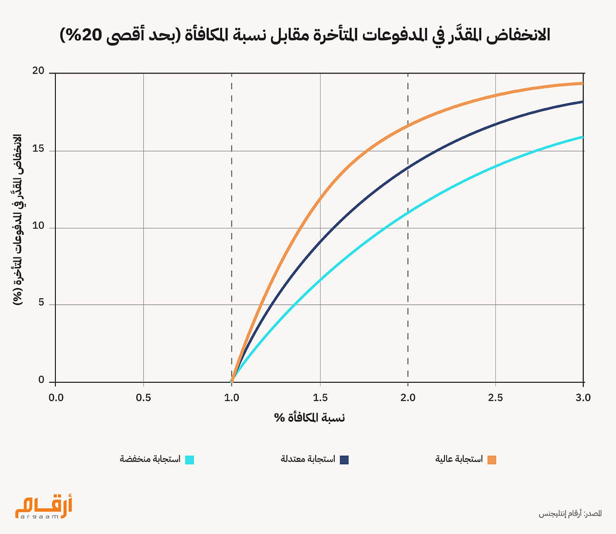 المصدر: VISA UAE/Argaam Intelligence (2024 data) ![]() وكما يتضح في الرسم البياني أعلاه، فإن رسوم التبادل محددة بحد أقصى 32,50 درهماً إماراتياً. وعند تطبيق رسوم تبادل تبلغ 1,5%، سيحتاج البنك إلى أن ينفق المستأجر نحو 2100 درهم إماراتي إضافية فوق الإيجار شهرياً لمعادلة التكلفة. وعند تطبيق رسوم تبادل تبلغ 2%، سيحتاج البنك إلى أن ينفق المستأجر نحو 1600 درهم إماراتي إضافية فوق الإيجار شهرياً لمعادلة التكلفة. وبالطبع، إذا أنفق المستأجر أكثر من هذه المبالغ، فإن البنك سيربح بشكل عام، ومن ثم يجب وضع حد أدنى شهري للاستخدام، ولنقل مثلا 4 الاف درهم. وتُعَد رسوم التبادل في الولايات المتحدة الأمريكية كذلك أعلى قليلاً، إذ تصل إلى نحو 3%، لذلك قد تستفيد البنوك من الاستهلاك الإضافي في الولايات المتحدة الأمريكية أكثر مما ستستفيد منه في دبي. وينطوي نموذج الأعمال الأمريكي لشركة بيلت الخاص بنظام بطاقات الائتمان أيضا على استرداد نقدي بنسبة 4% على جميع المشتريات. وهذه الميزة مربحة أيضاً للبنوك، لأنها تشجع المستهلكين على إنفاق المزيد ويشجع بشكل خاص على القيام بعمليات شراء أعلى ثمناً، والبنك يدفع للمستهلك مكافآت (مثل 4%) لكنه يحصل في المقابل على رسوم تبادل أعلى من التجار، خصوصاً في المشتريات الكبيرة. ![]() يوضح الرسم البياني أعلاه تقديراً لانخفاض المدفوعات المتأخرة عند مستويات مختلفة من المكافآت - اعتماداً على مدى استجابة المستأجر للحافز. وتبدأ جميع المنحنيات من 1%، وهي نقطة متفق عليها عموماً يبدأ عندها ظهور التأثيرات السلوكية. ● استجابة منخفضة (باللون الأحمر): لا يُغير المستأجرون سلوكهم كثيراً حتى مع ارتفاع المكافآت ● استجابة متوسطة (أزرق): تغيير سلوكي معتدل ● استجابة عالية (أخضر): يعدل المستأجرون سلوكهم بقوة لكسب المكافآت وجميع المنحنيات الثلاثة تميل إلى الأعلى. وهذا يعني أنه مع زيادة معدل المكافأة، يصبح المستأجرون أكثر تحفيزاً على دفع الإيجار في موعده. وعند نسبة 1%، تكون الانخفاضات متواضعة في جميع السيناريوهات. أما عند نسبة 2%، تصبح الفجوة بين الاستجابة المنخفضة والمتوسطة والعالية أكثر وضوحاً. وهذا الأمر يساعد صانعي السياسات على اختيار نسبة مكافأة توازن بين التكلفة (نفقات المكافأة) والتأثير (انخفاض حالات التخلف عن السداد).