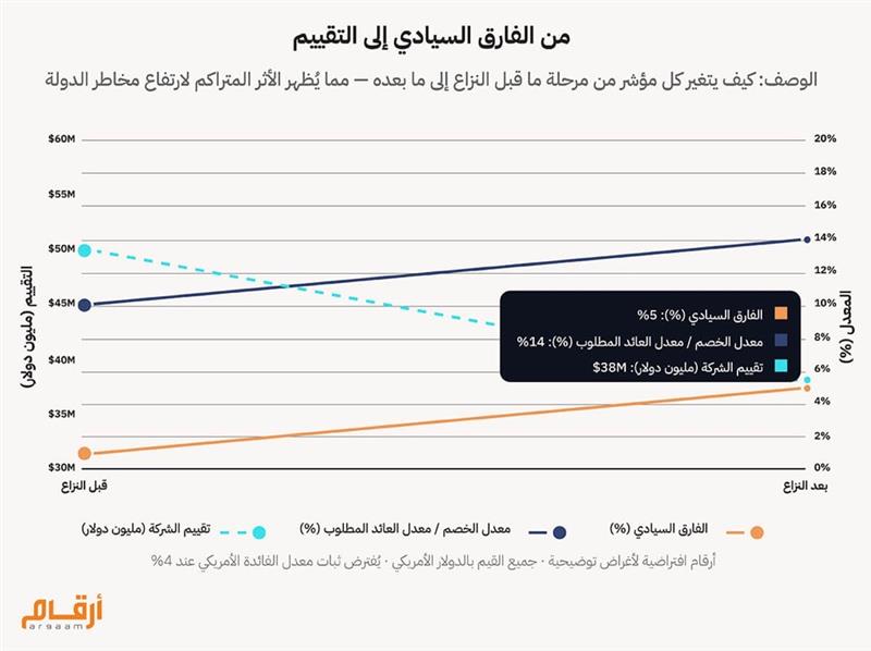 ملاحظة: علاوة المخاطر السيادية هي العائد/سعر الفائدة الإضافي الذي يطلبه المستثمرون لإقراض الأموال لحكومة دولة ما، مقارنةً بالإقراض لدولة أخرى بمنأى عن التوترات الجيوسياسية. وعند شراء شركة أو إبرام صفقة اندماج واستحواذ في دولة تتسم بارتفاع مستويات المخاطر، يحتاج المستثمرون إلى الإجابة عن السؤال المحوري: ما العائد الذي يجب أن أحققه ليكون هذا الاستثمار مجدياً؟ تجيب المعادلة التالية عن ذلك السؤال: COE = RfR + β × ERP + CRP تكلفة حقوق الملكية (COE) = معدل العائد الخالي من المخاطر (RfR) + معامل بيتا (β) × علاوة مخاطر الأسهم (ERP) + علاوة مخاطر الدولة (CRP) حيث تمثل الرموز ما يلي: ● تكلفة حقوق الملكية (Cost of Equity): هي معدل العائد الذي يشترطه المستثمرون مقابل ضخ رؤوس أموالهم في هذه الشركة؛ فكلما تصاعدت المخاطر، ارتفع سقف العوائد المطلوبة. ● معدل العائد الخالي من المخاطر (Risk-Free Rate): يمثل الحد الأدنى للعائد الذي يتوقعه المستثمر حتى في حال انعدام المخاطر. ● معامل بيتا (β) × علاوة مخاطر الأسهم (Equity Risk Premium): يقيس "معامل بيتا" مدى تذبذب سهم شركة معينة مقارنة بالسوق ككل، بينما تمثل "علاوة مخاطر الأسهم" العائد الإضافي الذي يطلبه المستثمرون لاختيار الأسهم بدلاً من السندات الآمنة. ● علاوة مخاطر الدولة(Country Risk Premium): هي العائد الإضافي المطلوب تحديداً مقابل ممارسة الشركة لنشاطها في دولة ترتفع فيها نسبة المخاطر. وعندما تتصاعد وتيرة المخاطر في دولة ما، يرفع المستثمرون تكلفة رأس المال. وتُضاف هذه التكلفة الإضافية مباشرة إلى العائد الذي يجب أن تتعهد به أي شركة في تلك الدولة لجذب أموال المستثمرين وتأمين التمويل المطلوب. ![]()