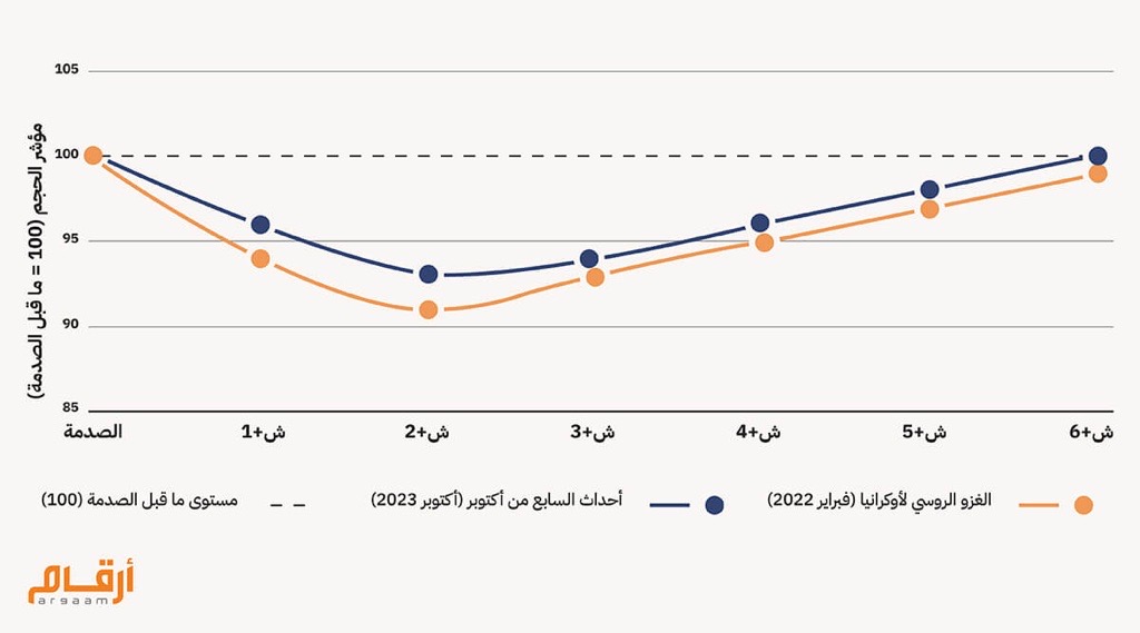 ● أدت الصدمتان إلى تراجع فوري في النشاط؛ حيث انخفضت أحجام الصفقات خلال الشهرين الأولين عقب كل منهما، وكان الانخفاض المصاحب للغزو الروسي لأوكرانيا أكثر حدة نسبياً مقارنة بهجمات السابع من أكتوبر. ● لم يتجاوز التراجع في كلتا الحالتين نسبة 10%، حيث استقر مؤشر الصفقات فوق نطاق (91-93) نقطة، مما يؤكد أن التباطؤ كان محدوداً مقارنة بخط الأساس ما قبل الصدمة البالغ 100 نقطة. ● كان التعافي سريعاً في الحالتين؛ فبحلول الشهر السادس، عاد نشاط الصفقات في كلتا الصدمتين إلى مستويات قريبة من خط الأساس، مما يثبت أن السوق شهد توقفاً مؤقتاً وليس انكماشاً طويل الأمد.