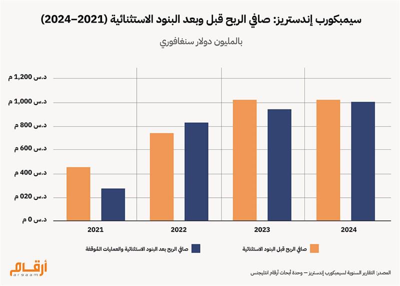 ملاحظة: الفجوة الكبيرة بين الشريطين في عام 2021 تعكس حدثًا استثنائيًا لم يتكرر، وهو انفصال شركة سيمبكورب مارين عن المجموعة، الذي استُبعد من أرقام الربح الأساسية. ومنذ عام 2022، تضيّق الفارق بين الشريطين بشكل واضح، مما يعني أن البنود الاستثنائية لم تعد تؤثر تأثيراً يُذكر على الأرباح المُعلَنة، وأصبحت الإيرادات التشغيلية المتكررة هي المحرك الرئيسي للنتائج السنوية.