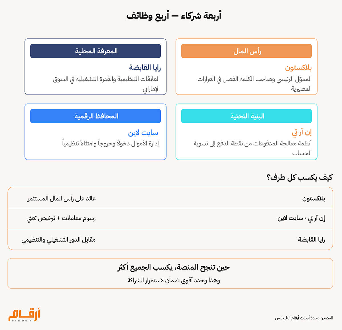 🤝 أربعة شركاء، وأربع وظائف لا تتقاطع لم تُفصح الأطراف في الصفقة عن تفاصيل الملكية أو آليات اتخاذ القرار في الكيان الجديد، وهذا أمر معتاد في صفقات من هذا النوع. غير أن طبيعة كل شريك وحجم ما قدّمه تكشف بنفسها عن منطق توزيع الأدوار. النموذج التجاري لهذا التحالف يختلف عن الشراكات التقليدية التي يتحدد فيها نصيب كل طرف بحجم حصته في رأس المال. هنا، كل شريك يكسب من خلال ما يُقدّمه فعلا: بلاكستون تحصل على عائد مالي بوصفها المموّل الرئيسي. شركتا إن آر تي و سايت لاين تحصلان على رسوم مقابل كل معاملة تمر عبر تقنيتيهما، إضافة إلى عوائد مرتبطة بترخيص هذه التقنية — أي أن دخلهما يرتفع تلقائياً كلما نما حجم النشاط على منصة الألعاب والمراهنات. أما شركة رايا، فتحصل على مقابل دورها التشغيلي والتنظيمي الذي يجعل المنصة قادرة على العمل في السوق الإماراتي أصلا. النتيجة هيكل يصبّ في مصلحة الجميع: حين تنجح المنصة، يكسب كل شريك أكثر — وهذا بحد ذاته أقوى ضمان لاستمرار التحالف وتماسكه. ![]() السؤال الجوهري هنا: لماذا اختارت بلاكستون هذا الشكل من الشراكة الرباعية بدلاً من الاستحواذ المباشر على أحد الأصول في الإمارات؟ الإجابة تكشف عن منطق أكبر يحكم طريقة تعامل رأس المال الدولي مع منطقة الخليج العربي في هذه المرحلة تحديدا بسبب التوترات الجيوسياسية. حين يتوزع الاستثمار بين أربعة أطراف، لا يتحمل أي منهم وحده تبعات الخطأ إن وقع. وفي بيئة قد يتقلب فيها المشهد الجيوسياسي بسرعة، وتكون فيها تكلفة الرهان الخاطئ مرتفعة، يصبح توزيع المخاطر ضرورة استراتيجية لا مجرد خيار تفضيلي.