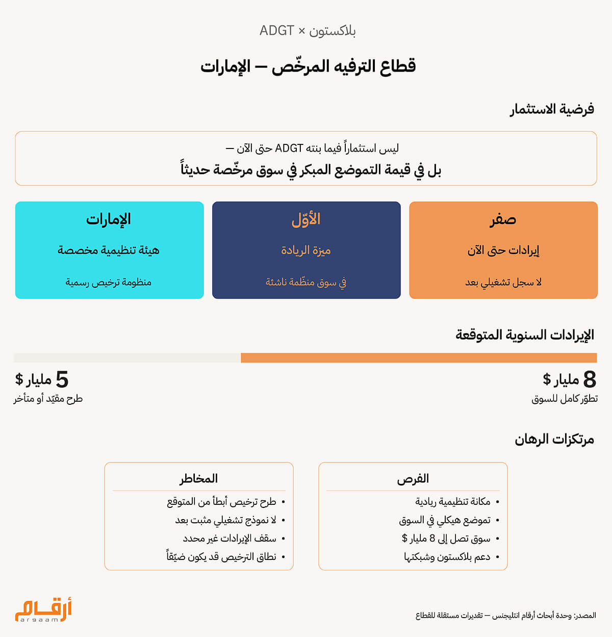 ⁉️ هل تستحق ADGT ربع مليار دولار وهي لم تبدأ بعد؟ شركة ADGT لا تملك حتى اللحظة أي سجل تشغيلي — لم تفتح أبوابها، ولم تحقق إيراداً واحداً، ولم تُثبت نموذجها في الواقع. بمعنى آخر، بلاكستون لا تستثمر في شيء أنجزته الشركة، بل في شيء قد تصبح عليه — والرهان الجوهري هنا هو أن الدخول المبكر إلى سوق منظّم حديثاً يُعدّ في حد ذاته ميزة تستحق الدفع مقدماً من وجهة نظرنا. السوق المقصود هو قطاع الترفيه والمراهنات الرياضية المرخّص في الإمارات (حديثا في سبتمبر 2023). فقد أنشأت الإمارات هيئة تنظيمية مخصصة لمنح تراخيص هذا القطاع والإشراف عليه، وهو تحول في السياسة العامة يفتح رسمياً سوقاً لم يكن موجوداً من قبل. والقطاع لا يزال في طور التشكّل، وكل شيء مرهون بمدى سرعة انتشار منظومة التراخيص واتساع نطاقها. فإن سار تطور السوق على النحو المتوقع، تشير تقديرات مستقلة إلى أن إجمالي إيراداته السنوية قد يبلغ ما بين خمسة وثمانية مليارات دولار. غير أن هذا الرقم قابل للانخفاض بصورة ملموسة إذا جاء الطرح أبطأ أو أضيق مما يُرتقب. وثمة نقطة جوهرية ينبغي استيعابها: هذه الشركة الحديثة ليست منشأة ترفيه بالمعنى المتعارف عليه — فهي لن تدير صالات ألعاب أو تتولى تنظيم الرهانات مباشرة. دورها أعمق من ذلك وأكثر استراتيجية: إنها تعمل في الطبقة غير المرئية التي تجري فيها الأموال — معالجةً للمدفوعات ومديرةً للتدفقات المالية التي تُشغّل هذا الاقتصاد وتُديم حركته.إيراداتها لن تأتي من الرهانات أو من نتائج الألعاب، بل من شيء أكثر ثباتاً: نسبة صغيرة تُقتطع من كل معاملة مالية تمر عبر منصتها. نعتقد أن تلك النسبة تتراوح بين 2 و3 بالمئة في السيناريو الأساسي، أي ما بين 100 و250 مليون دولار. وإن توسعت الشركة في خدمات المحافظ والامتثال وإدارة التدفقات المالية، قد يقترب الرقم من 400مليون دولار في السيناريو المتفائل. هذا بالإضافة إلى رسوم مرتبطة بأرصدة المحافظ الرقمية، وعوائد من خدمات الامتثال التنظيمي، وخدمات التحقق من هوية المستخدمين التي تشترطها الجهات التنظيمية على كل معاملة مالية. إذن، البنية التحتية للمدفوعات تكسب من حجم التدفق لا من نتيجة أي رهان بعينه، وتنمو كلما نما النشاط في المنظومة كلها. ![]() ولم تُفصح بلاكستون عن السعر الذي دفعته، لكن حجم الاستثمار الأولي البالغ 250 مليون دولار — مع الأخذ بعين الاعتبار أن حصص الأقلية في صفقات مماثلة تتراوح عادةً بين 20 و30 بالمئة، يشير إلى أن تقييم الشركة الحديثة وقت الصفقة كان يتراوح بين 800 مليون ومليار ومئتي مليون دولار. رقم ضخم لشركة لا تملك أي سجل مالي. لا يمكن تبريره بالأرقام الحالية، لأنه ببساطة لا توجد أرقام حالية. هو رهان على المستقبل، مسعَّر على أساس ما قد يصبح عليه السوق لا ما هو عليه اليوم. ![]() 🔦 كيف وصلنا إلى هذا التقييم؟ شركات المدفوعات المرتبطة بقطاع الترفيه المرخّص، ومنها شركتا paysafe و Nuvei المدرجتان في بورصتي نيويورك وناسداك على التوالي، وباعتبارهما الأقرب مقارنةً من بين الشركات المدرجة، اعتادت تاريخياً أن تُقيَّم عند أربعة إلى ستة أضعاف إيراداتها السنوية. شركة ADGT تُقيم في مرحلة أبكر من ذلك بكثير — قبل أن تبدأ العمل أصلاً — لذا يرتفع مضاعفها إلى ما بين ثمانية واثني عشر ضعفاً. هذا الارتفاع يعكس أمرين: كونها من القلائل التي نالت موطئ قدم في سوق لم تُفتح بعد، وارتباطها المباشر بكل معاملة مالية تجري داخل هذه السوق. حين تُطبَّق هذه المضاعفات على توقعات إيرادات آجلة تتراوح بين 75 و125 مليون دولار، يخرج التقييم الناتج متوافقاً مع النطاق الذي توقعناه لقيمة الصفقة، أي ما بين 800 مليون ومليار و200 مليون دولار. لكن تجدر الإشارة إلى أن هذه معادلة تقريبية لا حسابات قاطعة. فالنتيجة الفعلية ستتوقف على ثلاثة متغيرات: حجم السوق الذي سيتحقق فعلاً، ونسب الرسوم التي ستنجح الشركة الحديثة في الحفاظ عليها مع نمو المنافسة، ومدى صمود موقعها في مواجهة منافسين محتملين — سواء حاملي تراخيص جدد، أو 